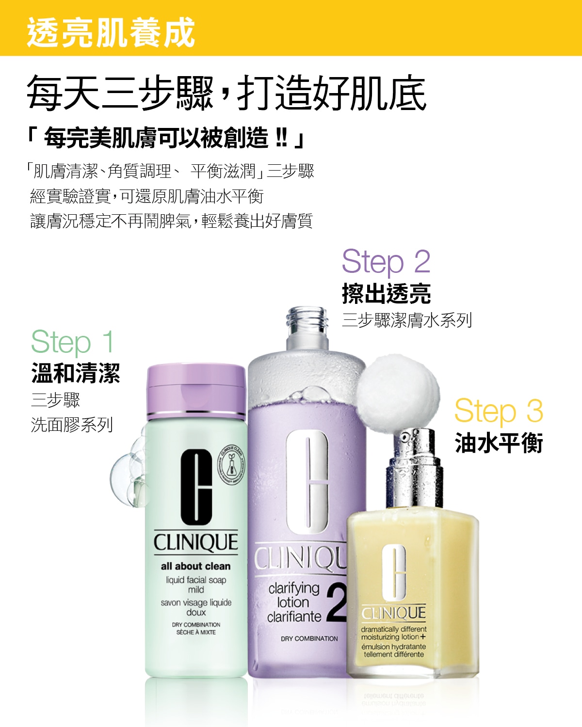 了解更多: 3步驟,3分鐘。每天兩次。 倩碧由皮膚科醫生研發的3步驟護膚流程簡單、有效、經典。由品牌創辦皮膚科醫師設計,這套3步驟保養法以科學方式打造健康肌膚。僅需3步驟,3分鐘,每天兩次。每一步都根據您的倩碧膚質類型量身訂製。